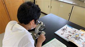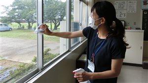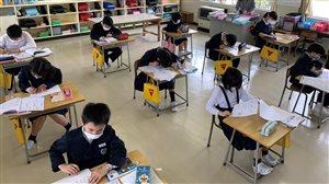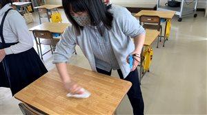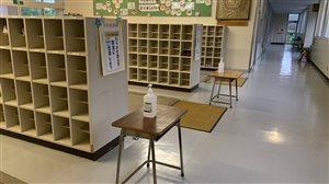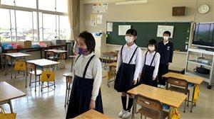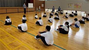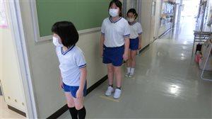 3密を避けるため、廊下側の窓はすべて開放、机の間隔を空け、ペア学習の場合も、体の向きを変えるだけとし、近づきすぎないようにしています。感染症のリスクの高い教科では、例えば、理科では、一人1台の顕微鏡、体育では、十分に距離を空けて運動し、手をつながないでフォークダンスを行うなどの工夫を行っています。