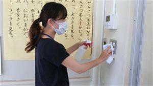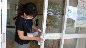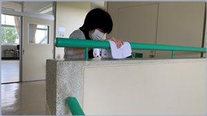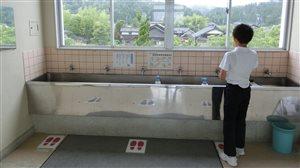手洗い・手指の消毒を行っています。登校後、外での活動から帰ってきた時、特別教室への出入り、共用物使用の前後等に行います。基本的に手洗いですが、手洗いが難しい場合は、消毒液を使用しています。職員玄関、児童玄関、教室前、体育館、図書館、特別教室前等に消毒液を設置しています。また、戸や手すり等、触れる機会が多い箇所は、職員が消毒作業を行っています。