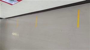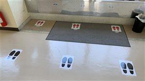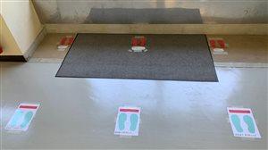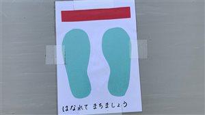 手洗い場所等密になりやすい場所に、目印を設置、空ける距離を見える化しています。