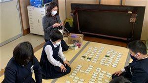 3学期のゴールデンタイム。全校児童が和室に集い、百人一首を行いました。静寂の中、札を詠む声だけが響きます。目を凝らし、自分の前に置かれた札を懸命に追う子供達。1年生達もとても頑張っていました。上級生になると、上の句を聞いただけで、札を取る強者もいます。集中することの楽しさを味わえたゴールデンタイムでした。