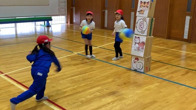 1・2年体育。テーマは「ボールを投げること」。先ずは「シャトルボール」。二手に向かい合って並び、ボールを投げて相手にパスしたら、反対側の列の後ろに並びます。これを繰り返します(ボールを往復〔シャトル]させます。)次は「的当て」。ボールを的目がけて当てます。そして最後は「ゴールゲーム」。ボールを持って走ってもいいですが、とまったらパスかシュート、つまり、ボールを投げなければなりません。子供達は3つの活動の中で沢山ボールを投げました。「投げる力」は投げなければつきません。これからもどんどん投げてほしいです。