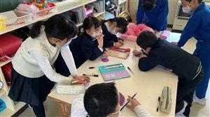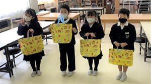 地域の方から沢山いただいた包装紙を使い、3・4年生に続き、1・2年生もエコバッグづくりに挑戦しました。時間をかけながら、一生懸命作っていました。出来上がりには全員大満足!!あくまで紙で出来ているので、使う際には注意が必要なこと等もしっかり聞いていました。1・2年生は何を入れるのでしょうね。