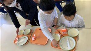 来年度より本校は自校給食ではなく、共同調理場方式に変わります。色々と変更になる部分もあるので、食べる場所も各教室ではなく、3Fのランチルームで一斉に食べることとします。ただ一斉となると、給食当番や配膳、片付けの仕方等慣れておかなくてはならないことも多いので、今頑張ってランチルーム給食を行っています。勿論教室の時と同じく「黙食」ですが、全校一緒に食べる給食はいつもとは雰囲気が違うようです。