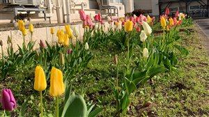 今日から弥生。花壇の様子をお知らせします。ご存じの通り、今年は雪がよく降り、花壇も雪に覆われる日が多かったのですが、そんな中でも、しっかりと葉を茂らせていた植物がありました。その名は「ヒメリュウキンカ」。今は黄色い元気な花を咲かせています。そしてその近くにはチューリップの芽が顔をのぞかせています。やっぱり、春はもうすぐそこまで来ているのですね。