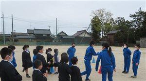 3年生が職員室に自分たちでつくった名刺を配りに来てくれました。配る際には条件があります。それは、話す言葉が「オールイングリッシュ」であること。ついつい日本語を使ってしまいもしましたが、よくがんばっていました。グランドでは車で引っ張って草を取り除く道具を他校の校務員さんの協力のもと作成。来月の運動会に向けて準備OKというところです。最後に体育館から。テーマは「様々な動きで体の能力を高めよう」。5・6年生が、4人1組で、離れて立ち、ボールを一斉に真上にあげ、その間に他の子のいた位置に走り寄り、落ちてくるボールをキャッチする等の運動をしていました。めちゃくちゃ難しいのですが、とてもとても楽しそうでした。