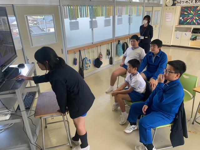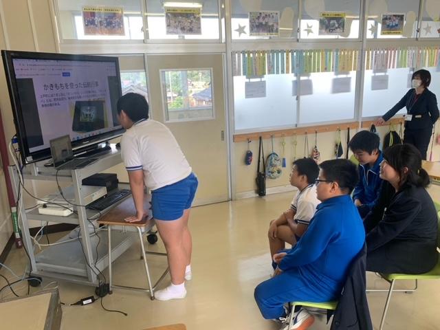 5・6年生は、総合的な学習の時間に、上戸町の名物「かきもち」の知名度を上げるために、学習しています。今回は、かほく市の金津小学校の6年生とオンラインで交流しました。子供達は、かきもちの魅力について、プレゼンテーションを上手く使いながら、堂々と伝えていました。市外の小学生にも、かきもちのことをしっかりと伝えられたようです。