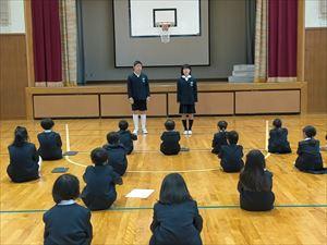 12月12日(火)に児童朝会がありました。はじめに、各種表彰がありました。入賞者の名前が呼ばれて、名前を呼ばれた人は「はい」と返事をして立ちます。今回は、どの児童も返事がとてもよかったです。