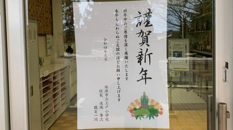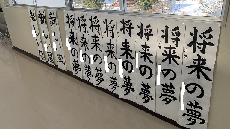 1枚目の写真。グラウンドに雪の線が見えます。これは暗渠の位置を示しています。暗渠の上は他の場所より温度が低いのか、周りの雪が解けても残っています。2枚目。昨年度も紹介しました。雪の下でもたくましく葉を出している「ヒメリュウキンカ」です。これからもっと成長していくのでしょう。3枚目。5・6年教室前の書き初め。12月に練習したものです。冬休み期間中の練習でどのように上達しているかが楽しみです。来週1月11日よりいよいよ3学期スタートです。