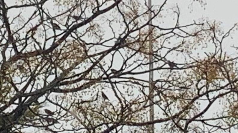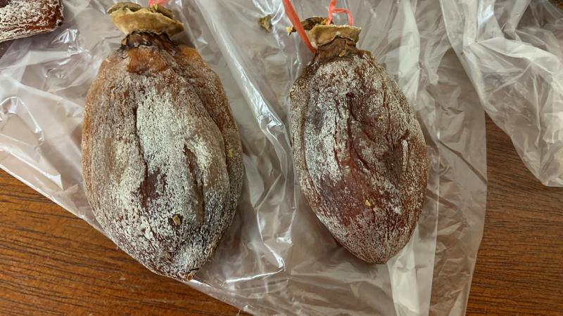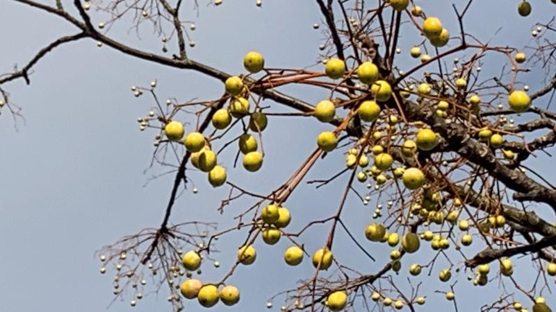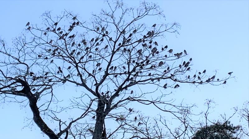 葉はすっかりなくなってしまったせんだんの木ですが、実はまだまだいっぱいあります。その実を目当てにやってくる鳥達の数がまたすごいです。冬のこの時期、せんだんの木がいかに鳥達にとって貴重かわかります。3枚目の写真は、干し柿です。少し残っていたのをそのまま干していたら白い粉をふいていました。今年の干し柿がうまく作れた証ともいえます。この柿も木にいたままだったら鳥達が喜んだかもしれませんね。