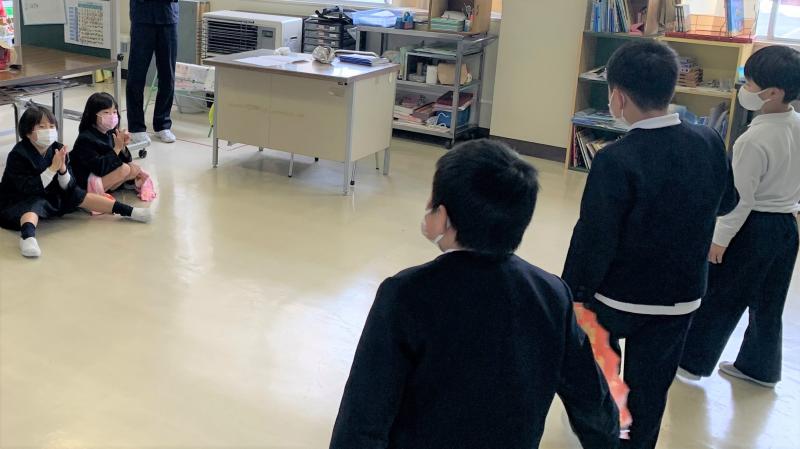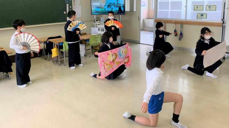 組曲の練習が続いています。今日は「きゃらげ」と「踊り」グループが合同練習を行いました。互いに見合うことで、意欲も気分も高まります。「きゃらげ」の指導は6年生のKさん。優しく見守り、一人一人にアドバイスを送っていました。扇の使い方等、大分板についてきたとのことです。いいアドバイスをもらって今後更に頑張っていくことでしょう。