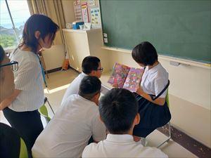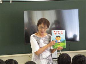 5月10日(水)の昼休みに司書の先生の読み聞かせがありました。1・2年生が対象でした。ひらがな2文字がページをめくるたびに、思いがけない言葉に変わっていきます。文字が変わる度に歓声があがりました。