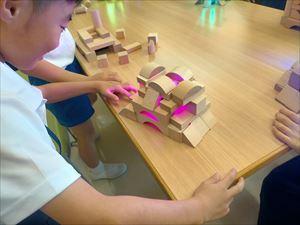 最後の電灯のスイッチを消したとたん、「ワーッ」と歓声があがりました。積み木と光源を組み合わせた作品が目の前に現れたのでした。
