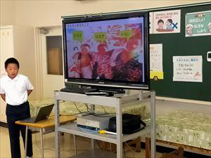 9月1日(金)に2学期の始業式を行いました。全員出席で2学期を迎えることができました。2学期にがんばってほしいことを話しました。終わりに「1学期よりも少しでもよくなるのは丸で、1学期よりわるくなるというのはバツです。」と話しました。その後5・6年生が夏休みの思い出について、発表してくれました。全員スライドを作って、それを見せながら発表しました。4択のクイズも入っていて、聞き手を引きつける工夫がされていました。