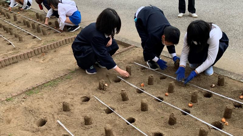 いつの間にか、もう来春に向けて、チューリップの球根を植える時期となりました。球根達が平等に養分をとれるよう、間隔をきっちり定めて植えました。あけた穴に球根を入れ、上から土をくずして丁寧にかけていきました。今回は、色とりどりのチューリップが咲く予定です(色んな色の球根を混ぜました)。楽しみですね。