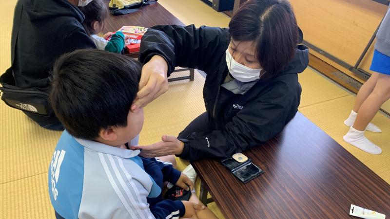 今年も柿農家様より沢山の柿を分けてもらうことが出来ました。そして、朗生会様をお招きし、その柿を使った上戸小「えがおの干し柿」づくりがはじまりました。1・2年生は、皮むきに、干し作業等に大奮闘!段々手つきも慣れてきて、もっとやりたいとも!この後、乾燥、てもみ作業を経て出来上がる予定です。もらった人が「えがお」になれるよう、この後も頑張っていきます。柿を分けていただいた農家様、お忙しい中ご来校いただき、子供達に手取り足取り丁寧に作業を教えてくれた朗生会様、本当にありがとうございました。