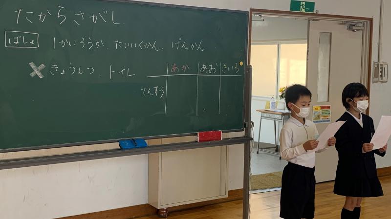 本日、2年生担当のゴールデンタイムでした。遊びは「宝さがし!」。2年生が隠した宝(点数を記載した紙カード)を制限時間内に探し、チーム毎に得点を競うというもの。これが大変に盛り上がりました!皆もう夢中で、あちらこちらで宝をさがしまくりました!(1年生が上手でした!)宝は全部で50枚でしたが、一人で5枚見つけた子が3人もいました。今回もとっても楽しいゴールデンタイムとなりました。