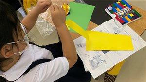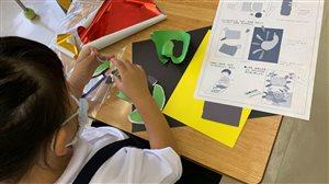 1・2年図工。「やぶいた形から生まれたよ」。今回は自由にやぶった紙が何に見えるかという学習でした。「見立てる」ことで想像力が育まれていきます。子供達の自由な発想、伸びやかな感性には、本当にいつも驚かされます。