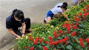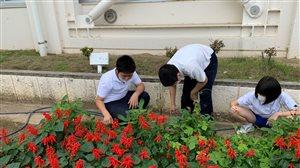 花壇の花々は順調に生育していますが、その花々に負けないくらい雑草も元気に伸びてきました。その伸びを気にしつつも、このところの雨続きでなかなか草むしりが出来ず、本日ようやく出来ました。児童・職員総がかりです。やはり手数が多いというのはすごいもので、たちまちの内に花壇がスッキリしました。草むしりが済んだ後、サルビア達から御礼を言われているような気がしました。
