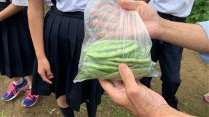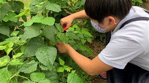 5年生が育ててきたインゲン豆を収穫しました。先ず、収穫の仕方を聞き、一さやずつ丁寧に切り離し、大切に収穫。生き生きとした見事な実でした。本日の給食にも「胡麻和え」として登場しました。とても柔らかく美味しかったです。今日から給食のお椀が新しくなりました。胡麻和えの食器ではなかったけれど、お椀の可愛い模様の花は、インゲン豆の収穫を祝福しているようでした。