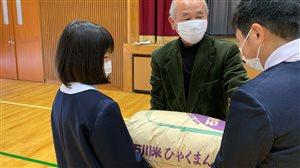 本日、すず農業振興協議会様より、本校に新米30kgをいただきました。品種はCMでもお馴染みの「ひゃくまんごく」。30kgはかなり重く、受け取り代表として出た6年生2名がやっと持てました。しかし、その重さ以上に作って下さった方々、届けて下さった方々の思いがたくさん込められているはずです。また、御礼を述べた6年生の態度はとても立派なものでした。新米に負けず輝いていました。新米は今後給食に出ます。楽しみです。