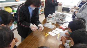 朗生会の方々に教えていただき、1・2年生が一生懸命つくった干し柿がようやく出来上がり、本日ラッピングを行いました。例年より柿が大ぶりだったこと、天候があまり思わしくなかったこと等で、干し上がるのに時間がかかりました。(最後は校舎内で扇風機をあてました。)しかし、苦労の甲斐あって、美味しそうな干し柿が出来上がりました。名付けて「えがおのほしがき」。ラッピングの紙に1・2年生が一生懸命描いた絵も素敵な笑顔です。食べる人、もらった人が皆笑顔になれるようにという願いが入っています。たくさんの方の笑顔、楽しみです!