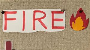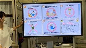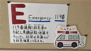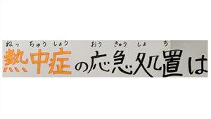 保健室の前には、熱中症になった場合の応急処置の方法が掲示してあります。タイトルは「熱中症の応急処置はFIRE」。応急処置のポイントを表した英語の頭文字4つを組み合わせています。