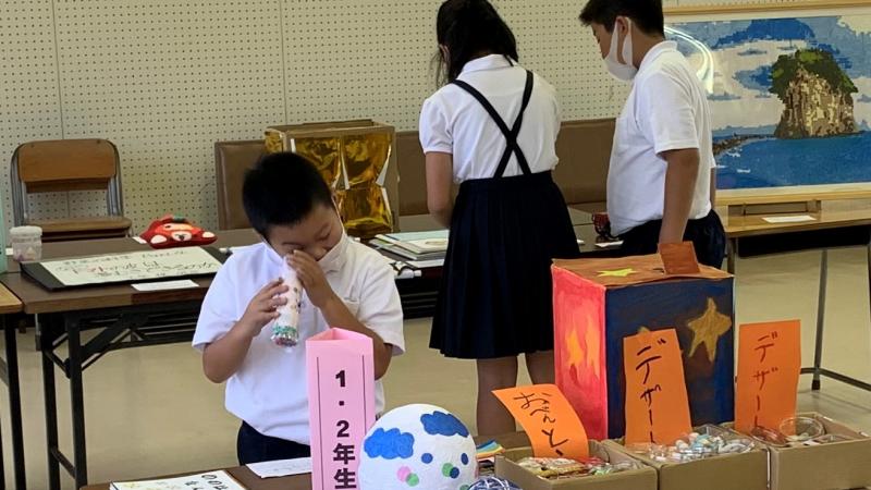 1・2年生も出来る範囲でタブレットPCを活用しています。先ずは「算数」。切り抜いた図形を組み合わせて色々な形をつくる学習です。これまでは、折角つくっても、記録できなかったのですが、タブレットPCのカメラ機能で保存することが出来ます。そして、オンライン交流。今回は市内の小学校1・2年生と自己紹介や、好きなもの等を紹介し合いました。互いに初めて会ったのですが、元気な声で交流を楽しんでいました。