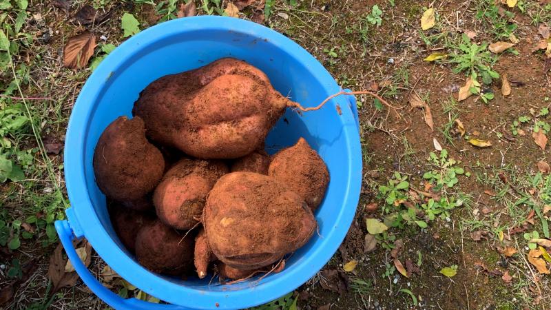 1・2年生が育ててきたサツマイモを収穫しました。昨年度土がかたくて掘るのに苦労したので、植える場所を変えたところ、葉が思ったほど繁らず、ちゃんと育ったか心配でしたが、しっかりサツマイモが出来ていました。子供達はサツマイモを見つける度に「あったーっ!」と大歓声!今年の畑は土がやわらかく、ほぼ思い通りに掘れたようです。見た目も綺麗でしたが、味もきっと素晴らしいでしょう。楽しみですね。(因みに今年は甘みが特徴的な安納芋という品種です。)