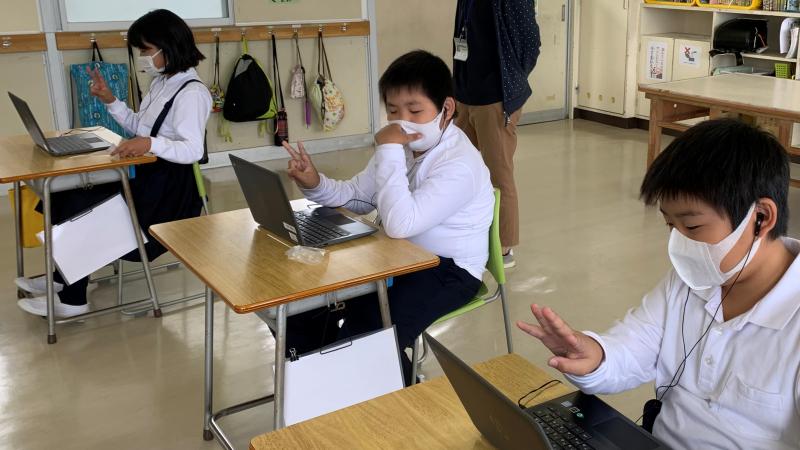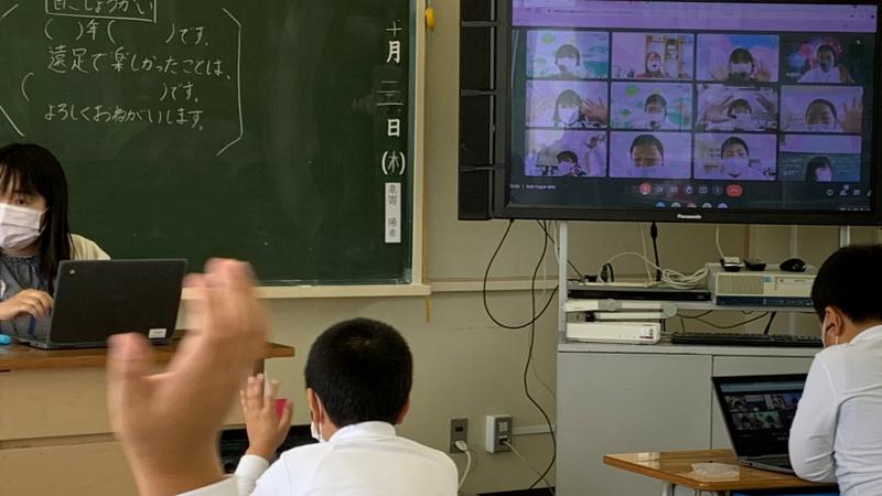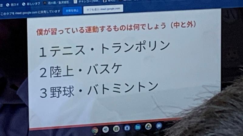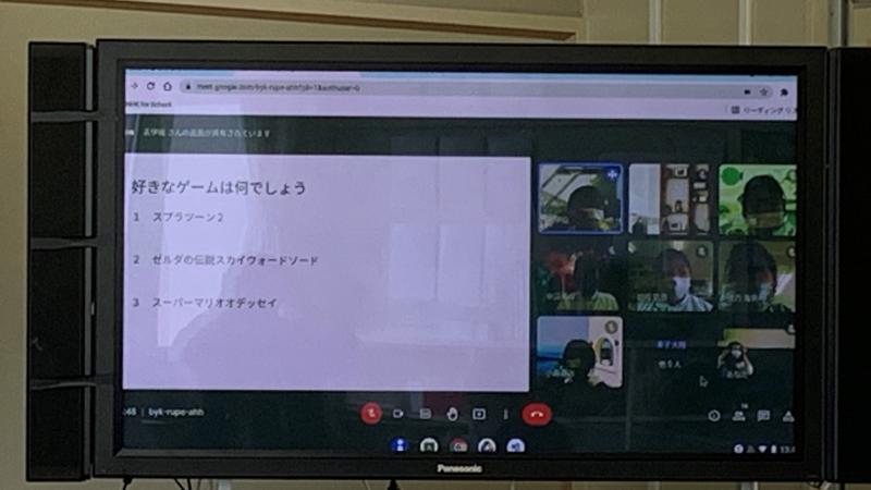 今年度、本校3・4年生は、輪島市内の小学校とリモートでの交流を行っています。本日が2回目でした。今回はお互いにクイズ(3択)を出し合いました。三択なので、指を立てた数で自分の予想を伝えられます。「ぼくの好きな〇〇は何でしょう?」的なクイズですが、とっても盛り上がっていました。3回目は3学期に予定しています。今度の交流内容もすごく楽しみです!