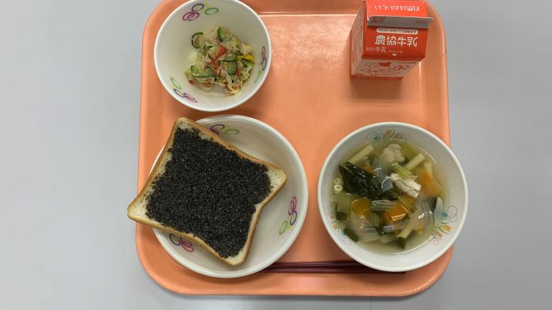 「スポーツの秋」&「食欲の秋」にちなんだニュースです。今週、昼休み限定で体育館に卓球台を出してみました(本校には卓球台が3台あります)。興味のある子がいて、そして中には結構上手な子もいて、楽しそうにプレイしていました。これからも様子を見て卓球台を出してみようかと思います。そして、今日の給食も紹介します。「黒ごまきなこトースト」が出ました。黒ごまときなこの両方の良さが感じられる一品で、トーストの歯ごたえもよかったです。工夫された献立だと感心しました。いつも素敵な給食をありがとうございます。