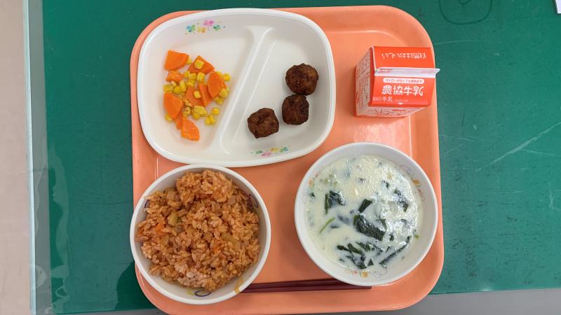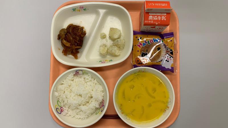 本日の給食を含めて3日間、「物語給食(物語本にちなんだ給食メニュー)」でした。水曜日は【物語給食:給食番長】(主なメニュー:「給食番長カレー」「ひじきサラダ」●お話の中にこのメニューが出てくる)、木曜日は【※写真1枚目 物語給食:バムとケロのそらのたび】(主なメニュー:「バースデーケチャップライス」●主人公が食事用のケッチャプで危機を切り抜ける)、本日金曜日は【※写真2枚目 物語給食:ハロウィーンのひみつ」(主なメニュー:「パーティのかぼちゃスープ」●ハロウィーンと言えば『かぼちゃ』!)。読書の秋と食欲の秋がうまく融合されたとても素敵な企画ですね。