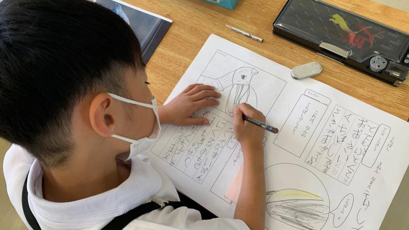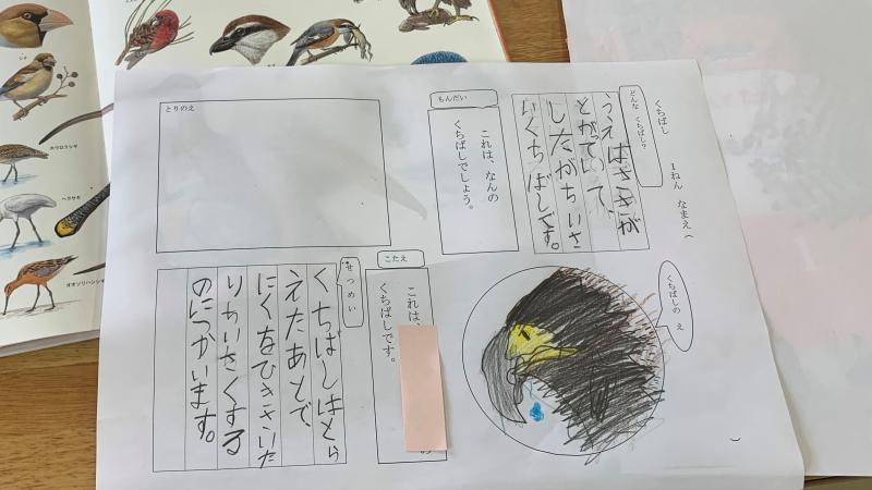 1年生が国語で「くちばし」という説明文を勉強しています。そして、学んだことを生かして色々な鳥の「くちばしクイズ」をつくっています。図書室から図鑑や絵本をさがしてきて、自分達で絵もかいています。楽しそうなクイズが次々とできていました。クイズを出される方も、きっと喜んでくれることでしょう。