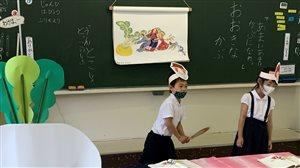 大きなカブ。おそらく殆どの方が知っているであろうこのお話。毎年1年生がこの時期音読劇を行います。このお話にはたくさん登場人物が出てきますが、1年生は2人。そこで登場人物の顔を描き、それを持っての音読劇となりました。しかし2人でも大きな声で、しっかり音読劇が出来ました。聞いていた2年生も、とてもほめてくれました。2人にとって、いい自信になったことと思います。