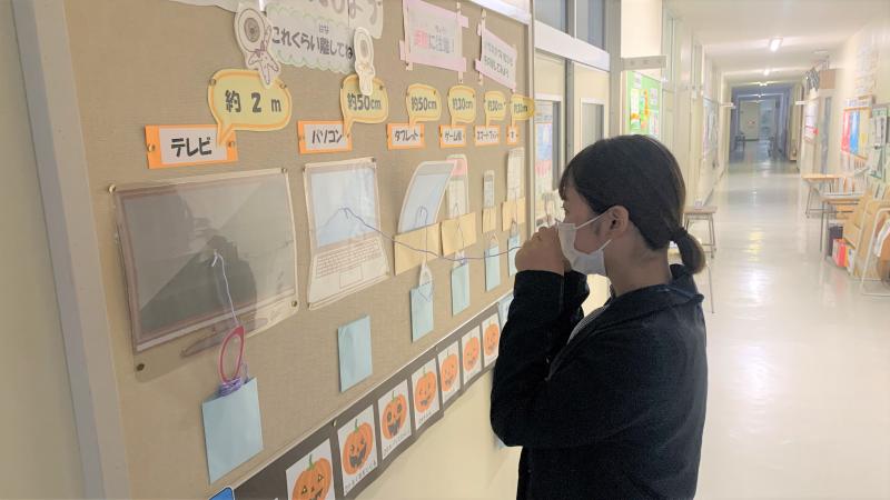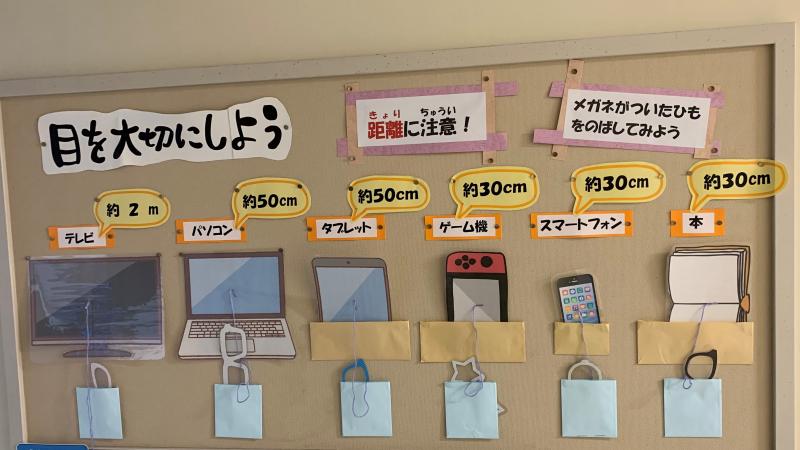 めっきり夜が長くなってきました。家にいる時間も長くなり、目を使う時間も増えてきているかもしれません。そこで注意していただきたいのが、目との距離。保健室前の掲示板では、テレビやパソコンとの適切な距離を体験できるようになっています。目が疲れた時の体操法も示してあります。目はとっても大切です。是非見てほしいです。