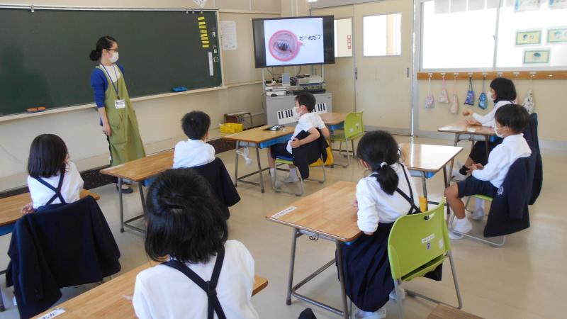 今週は、全学年の視力検査を行いました。全国的に小中学生の視力低下が増加傾向にあります。本日は、1年生と2年生の視力検査をし、検査後は「これは何の動物の目?クイズ」や「目を健康に保つために気をつけたい5つのこと」について勉強しました。毎日使う「目」大切にしたいですね。