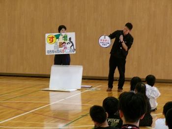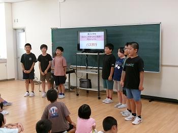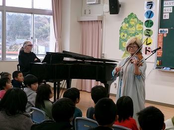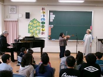 静さんと2名のゲストを迎え、素敵な生演奏とトークを聴かせていただきました。またヴァイオリンの楽器体験もありました。演奏の後のトークでは、やりたいことが叶うおまじないとして、「なりたい自分を具体的にイメージしてワクワクする気持ちを持つこと、そのやり方を頭で考えて指令を出す」ことを教えていただきました。最後は、6年生の校歌のピアノ伴奏に合わせて、ヴァイオリンを演奏して下さり、それに合わせて、全校で校歌を歌いました。短い時間でしたが、優しいピアノの音色と温かいヴァイオリンの音色と元気が出るトークで、心が満たされた有意義な時間となりました。鵜川小へ来て下さった皆様、ありがとうございました。