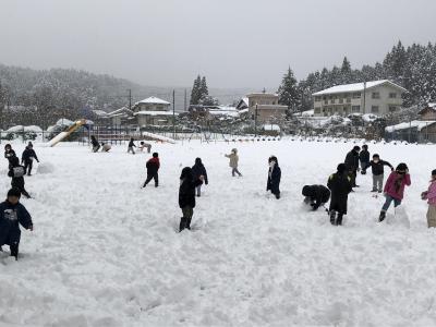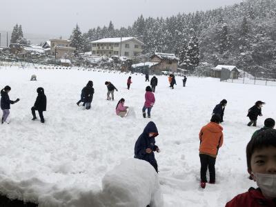 大雪で、運動場が絶好の雪遊びの場となりました。昼休みには、たくさんの児童が運動場に出て、久しぶりの雪遊びを楽しんでいました。