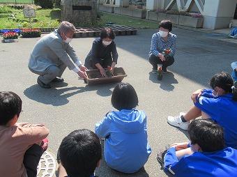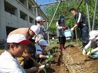 5月15日(月)、4年生が野菜の苗を植えました。畑の先生は蓑島さんです。トウモロコシ、トマト、スイカ等を植えました。上手に植えるコツを丁寧に教えていただきました。「ちゃんと育つかな・・・。また見に来ます!」とおっしゃっていました。大変心強いです。収穫できるのが楽しみです。有り難うございました。