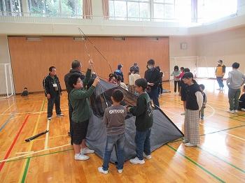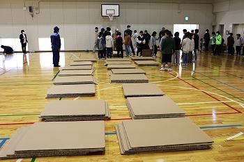 11月11日(土)、石川県防災総合訓練がありました。今回は地域の方が学校へ避難し、間仕切りや室内テントの設営、スリッパ作りを体験しました。実際にこのような状況になった時、体育館はどのように使用されるのか、自分でできることは何かについて教えていただきました。