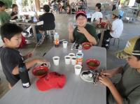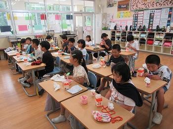 7月18日(木)は、1・2年生が運動場で水遊びをしました。ペットボトルに水をくんで、友達同士かけ合いをしたり、自分で水をかぶったりして、とても楽しそうでした。また、3・4年生は午前中は磯観察に行き、午後はお楽しみ会でドッジボールやテニスをしました。5・6年生もお楽しみ会があり、5年生はチーズケーキを6年生はチョコフォデュを作ったり、スポーツで汗を流したりしました。どの学年も今日は楽しい一日でした。