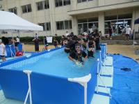 大きなプールを3台購入し、運動場に並べ、そこに水をはりました。また、学校でも水鉄砲や水風船を用意しましたが、家から水鉄砲を準備してくる子もいて、今日の水遊びをとても楽しみにしていることが分かりました。子ども達から「やりたいこと」に出ていたかき氷やすいか割りも取り入れました。限られた時間でしたが、みんなの思い切り遊ぶ姿が印象的でした。義援金のおかげで実現した「水遊び」ですが、今日のこのプロジェクトを通して、子ども達が元気になって、今後もより充実した学校生活を送ってほしいと思います。