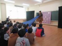 また、防犯教室では、まず不審者対応の避難訓練がありました。その後、体育館に集合し警察署員の方から、登下校時等に不審者と遭遇した時の対処方法について学び、実際に知らない人に捕まれたときの対応方法の練習をしました。練習では、素早く逃げることはできましたが、とっさに大声を出すことの難しさを感じました。珠洲警察署の2名の職員の方々には、お忙しい中、色々と教えていただきました。ありがとうございました。