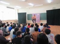 11月29日(金)3限目は、長野県から来て下さった「人形芝居燕屋」のくすのき燕さんによる腹話術と人形芝居を全校児童で鑑賞しました。腹話術は「カンクロー」という人形が登場し、カンクローが牛乳を飲んだり歌を歌ったりしました。人形芝居は「3まいのおふだ」でした。どちらもつかみバッチリ、笑いどころ満載でした。おかげで、子ども達はずっと笑ってばかりの1時間を過ごしました。くすのきさん、たくさんの笑いを届けて下さってありがとうございました。
