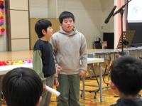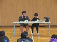 代表委員会は「ハッピーにすごそう。そのために相手の立場に立って行動しよう」、図書委員会は「当番の日はよゆうを持って当番にこよう」、保健委員会は「インフルエンザにかからないように、さわやかチェックを完ぺきにしよう」、給食委員会は「シールの色に気をつけよう(シールの色に気をつけて盛りつけをしよう)」でした。その後、給食委員会が給食当番役や食べる役などを演じ、盛りつけする時に気をつけてほしいことについて、劇を通して伝えてくれました。集会での司会や初めと終わりの挨拶は4・5年生が行いました。