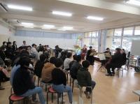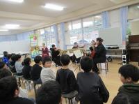 12月9日(月)5限目に、北國銀行が企画して下さった「能登復興応援コンサート」がありました。オーケストラアンサンブル金沢の4人の演奏者の方に加え、2学期6年生と大小連携事業でお世話になった星稜大学の直江先生が歌手として来て下さいました。