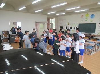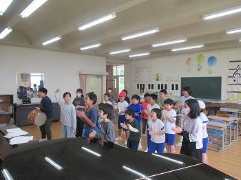 6月11日(火)の午前中、小木小、宇出津小、鵜川小の5・6年生88人が能都中に集まりました。今年度で小木中が閉校することで、この3校は中学校で一緒に過ごすことになります。そこで中学校に入学するまでに、少しずつ交流を深めていく目的で、今日の会が催されました。前半は、長野県の信濃楽団5名の方によるチャリティーコンサートを能都中・小木中の生徒と一緒に鑑賞しました。ジュピター(ホルスト)や威風堂々(エルガー)等、聞いたことのある楽曲もあり、生の迫力ある演奏に引き込まれました。後半は、小学校3校によるレクリエーション交流会でした。初めは,自分の学校同士仲間集めをしていましたが、いつの間にか心がほぐれて、他の学校の児童と一緒に手をつないだりして、楽しく交流していました。最後に感想はありませんか?と聞かれたのですが、鵜川小からは二人も手を挙げて自分の感想を堂々と言っていたのがすばらしかったです。
