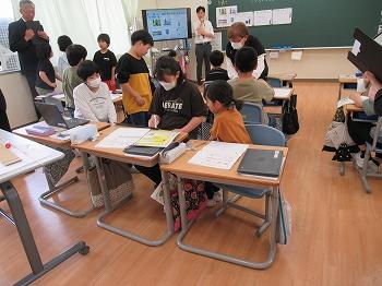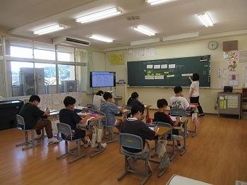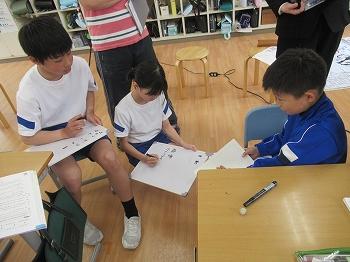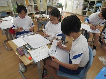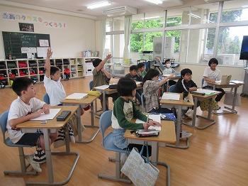 5月28日(火)、今日の1限目に、6年生は外国語科で「日常生活について友達と紹介し合おう」を、5年生は算数で「計算のきまりをマスターしよう」という課題の授業をしていました。6年生は自分の休日の生活について書いた英文を友達同士で読んで交流し合っていました。5年生は計算のきまりについてホワイトボードに書いた自分の考えを見せ合いながら話し合っていました。さすが、高学年です。授業中に自分の意見を相手に伝えることを通して、言い方に慣れたり、適切な表現ができるようになったりして、学習を深めていました。また、5年生は5・6限目に家庭科で調理実習をしました。ゆで野菜を作り、手作りのフレンチドレッシングをかけて食べました。ぜひ、家でも作ってみてほしいと思います。