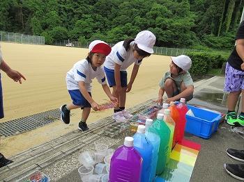 6月5日(水)の2限目は、1・2年生は図工の授業でした。1年生は「カラフルいろみず」の勉強で、水を入れたペットボトルに絵の具を入れて、ペットボトルを振るときれいな色水ができました。2年生は「ひかりのプレゼント」で、透明なカップに色をつけて光を通すとカラフルな影が地面にうつりました。その2つの活動を今日は8人全員で外に出て仲良く楽しみました。