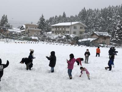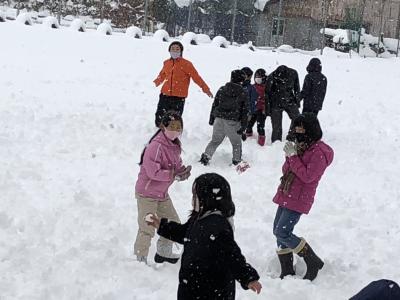 大雪で、運動場が絶好の雪遊びの場となりました。昼休みには、たくさんの児童が運動場に出て、久しぶりの雪遊びを楽しんでいました。