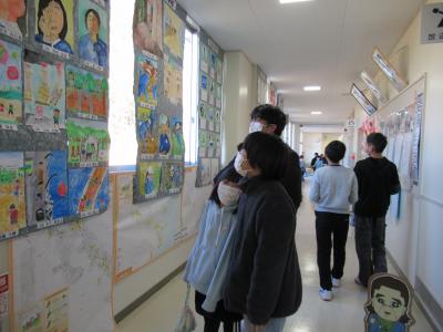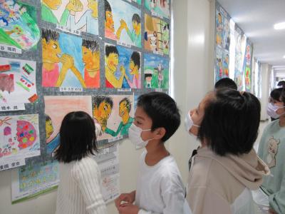 能登町の児童・生徒の図画作品が各学校に順番に巡回作品展としてやってきました。他の学校の子ども達の作品を見る子ことはとても刺激になります。みんな真剣な眼差しで見ていました。